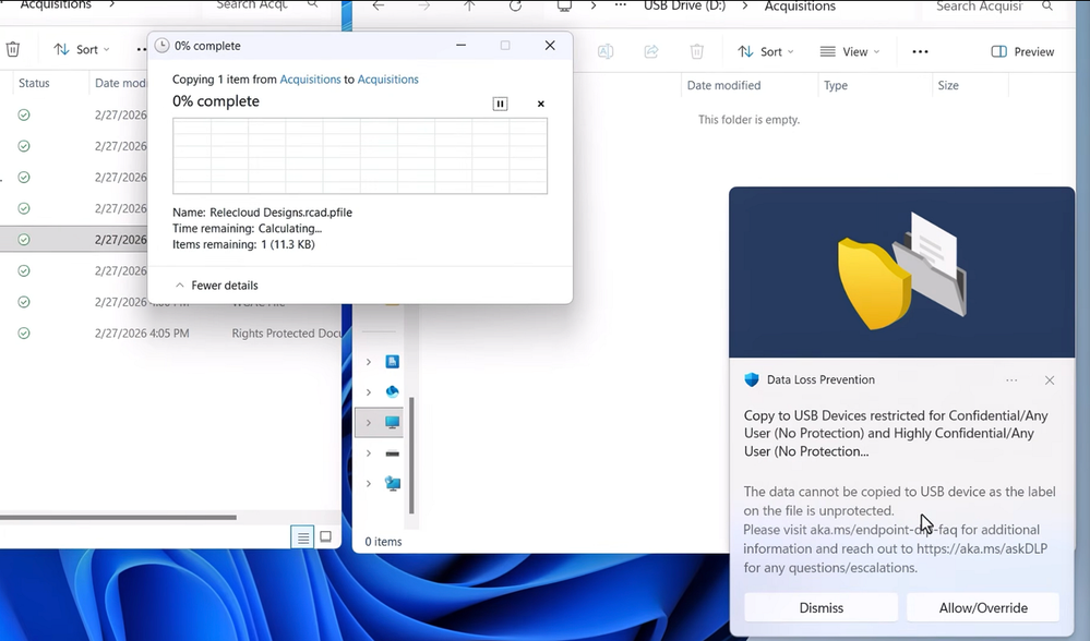 - Okay, so now we’ve got all of our policies in place. Why don’t we see how those protections show up in the flow of work, including AI interactions? So first I’m going to upload the same file that Matt showed before, but this time, it has a confidential label applied. So when I try to share it externally, you can see that I’m blocked instantly because that label is detected right away. DLP blocks the action based on the label, and this, again, is before that file could be scanned for sensitive information. Now I’m going to switch desktops. On the left here is a window with a synced folder in File Explorer. And you can see that there are proprietary file types and CAD files like we saw before, and each are labeled but cannot be analyzed for sensitive information types or classifiers. So with the labels applied to these encrypted P files, as they are, if I do try to drag and drop a file into my removable USB driver location in the window on the right, you’ll see I get a data loss prevention notification. Now because in this case, I’m under the file count threshold that we set before in policy, I can allow or override this, but I would’ve been blocked outright if I had transferred multiple files. Now again, the labels in these uncommon file types are what triggered the data loss prevention policy. And inside of risk management, it is also watching for risky handling of labeled content. For example, I can currently access this highly confidential acquisition site and see all the documents contained within it, for the moment. That said, though, because I just attempted to copy confidential information to my external USB drive, that’s going to catch up with me and automatically change my risk profile. So now after some time has passed, if I try to access that same site, I’m blocked outright and denied access. The protection automatically adapted to my heightened risk profile and blocked the site, without the administrator even needing to take any action. And by the way, the same assessment against risk profile would happen if it was an AI agent and it tried to do the same thing. And beyond agents, why don’t we look at label protection, and how that works in general with AI. So here I’m in Copilot and I have a document uploaded to SharePoint. So I’ll prompt Copilot to summarize the file named Relecloud Acquisition, and you’ll see that Copilot will first check the user’s permissions and the presence of a label before it does anything. Now, because this document is labeled as highly confidential and we have a DLP policy in place to block Copilot from processing sensitive files, it tells me that it can’t summarize that content because of its sensitivity label.