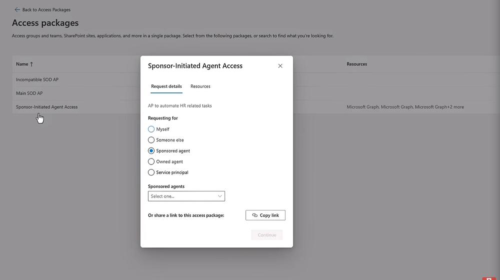 -Importantly, these access package requires agent sponsor to approve any agent requests for access and it requires a business justification as well. Let me show you how the access request process works. I’m logged in as a human agent sponsor with the My Access portal open. I’ll browse Available access package. And here, the Sponsor-Initiated Agent Access package that we saw before. Clicking to exposes which identity I’m requesting access for, and I’ll keep the Sponsor agent option, and I’ll choose our HR Actions Agent. Next, I just need to enter a business justification. I’ll enter Timebound access for HR agents, then submit the request. Once the request has been approved, the agent will work according to my policies. And now, I can even create specific conditional access policies that will assess this realtime as agents try to access resources.