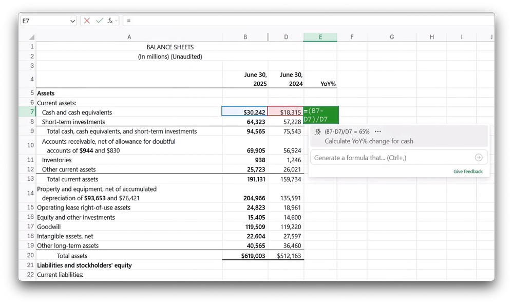 -And that’s just one formula, and there are hundreds of others in Excel where even the best power users don’t know every single one. And that’s where the new formula completion helps you choose the right formulas using the context around your data to form a recommendation. I’m in Excel on the web, and I’ll type = in a cell. Copilot analyzes the context, the headers, the nearby cells, tables, and suggests a formula. For example, if I’m calculating year-over-year growth, because the column name here is YoY%, Copilot automatically suggests = /the last year again, D7. And it even shows a preview of the result as a percentage and a natural language explanation of what the formula does.