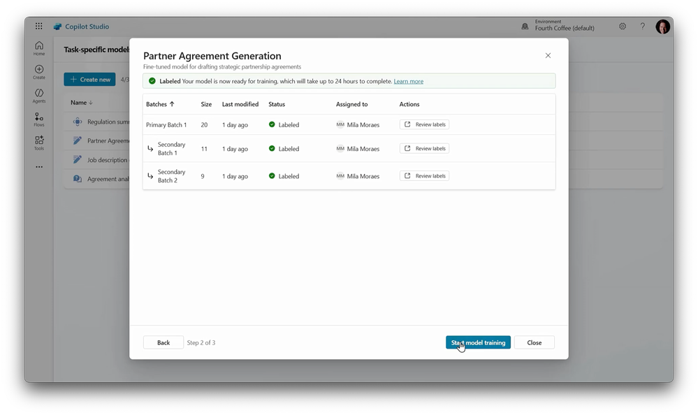 -Now with everything finished, I can publish the model to my Microsoft 365 tenant. And it will be available to anyone we’ve shared it with, like our audit team from before, to build new agents. And the process I just showed is called supervised learning, where the model is trained on label data. And soon, you’ll also have the option to use reinforcement learning to enhance the agent’s reasoning capabilities. Now let me show you how to build an agent from Copilot Chat that can leverage our new task-specific model for partner agreement generation. So I’m going to select Create agent. And for the purpose, I have a new option here to build a task-specific agent. Next, I can choose from the existing task-specific models. So I’m going to choose the one that we just created for new partner agreements. There we go. And with any agent, I just need to give it a name. Now I’ll paste in a description for people on the team to know its purpose and what it can do.
