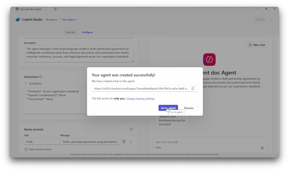 -And next, I can specify additional instructions as guidelines to provide more context to the agent, as I’m doing here to ensure the structure aligns with our organizational standards. Because this is a very specific agent to write partner agreements, I’ll just specify one starter prompt with details for referencing a precedent source document to start with and a term sheet to get specific new information from, kind of like we saw before. Now, the preview on the right looks good, and I can create the agent right from here. For sharing, permissions also need to align with whoever my task-specific model was shared with, which, as you’ll remember, again, was our audit team. In this case, for my own validation, I’ll select only you so that I can test it before sharing it out with other auditors on my team.