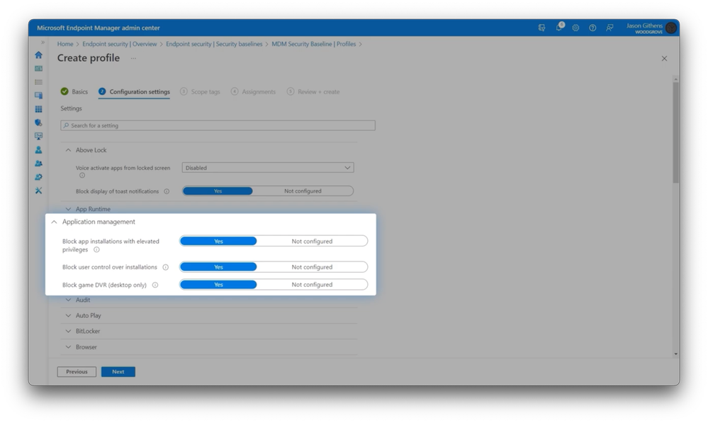 -So now that I’ve shown the options for device enrollment and the Windows Autopilot experience versus Azure AD join, let’s switch gears to the admin options for setting up your Intune environment, so that any Intune enrolled device receives your required apps and policies, then I’ll show you how to set up Windows Autopilot. First, you can use configuration profiles to configure all of your required policy settings, as well as default Wi-Fi settings and more. You’ll see that I have several created here, and many of these are targeted to all devices. To save time, in endpoint security, security baselines, you can easily create policies with Microsoft security recommendations enabled by default, that you can scope to all devices. Here, you can see all of the categories. I’ll expand this one for application management, and you’ll see a few important settings to block unwanted app installation. Finally, if I navigate to my Windows apps, these ones marked all are installed on all enrolled devices, and the ones without the all prefix are optional apps that users can self-install.