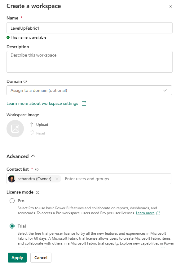 - In the License Mode choose Trial or Fabric Capacity.