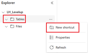 - In the Lakehouse explorer, hover over the Tables folder (not Files folder) and click on the ellipsis and click “New Shortcut”.