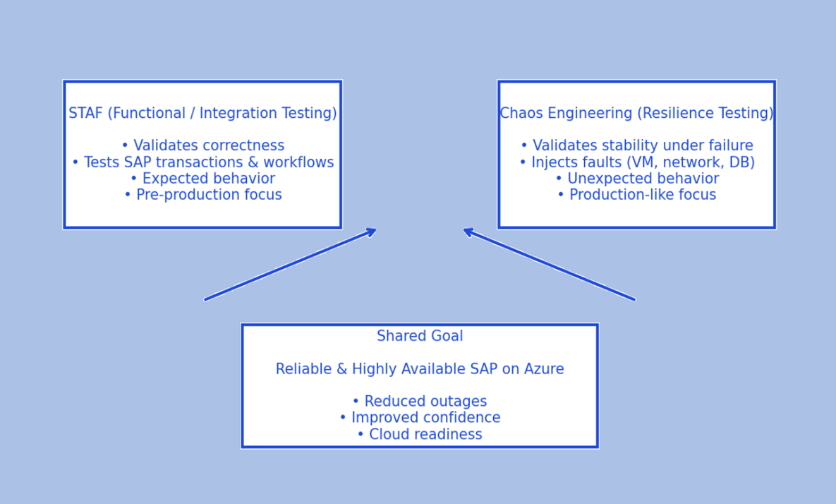SAP workloads often underpin core business processes. Downtime or misconfiguration can lead to significant operational and financial impact. While both Chaos Engineering and STAF aim to improve system reliability, they do so in very different ways.