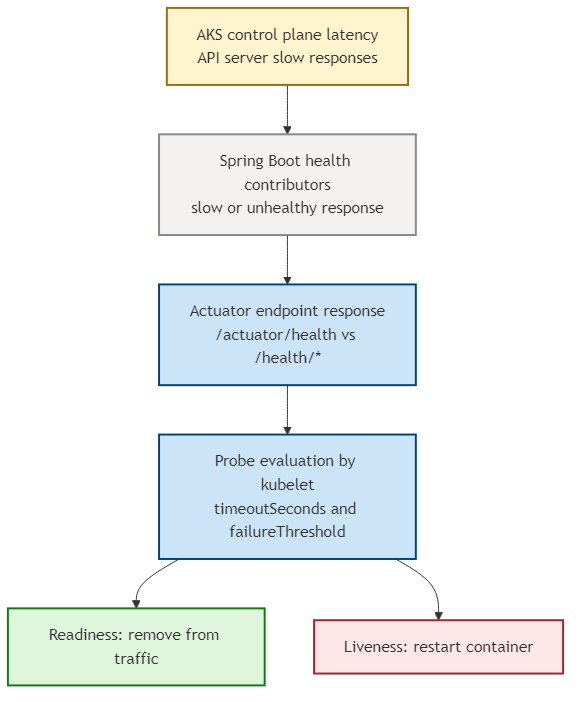 This diagram shows the causal chain at a glance: a transient platform issue can surface as slower health responses, which then interacts with probe thresholds to decide whether traffic is removed or containers restart.