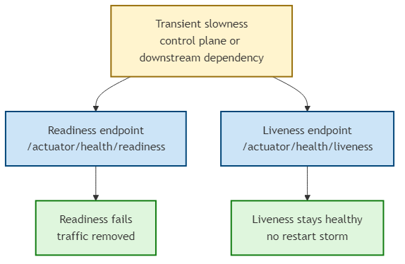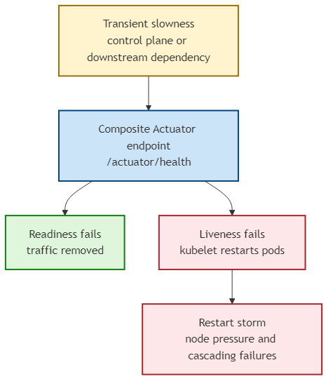 A key lesson is that probing the consolidated /actuator/health endpoint can amplify blast radius: if any health contributor degrades, the overall endpoint can report unhealthy. When that endpoint is used for liveness, kubelet can restart pods at scale and create a feedback loop (mass restarts → node pressure → additional failures).