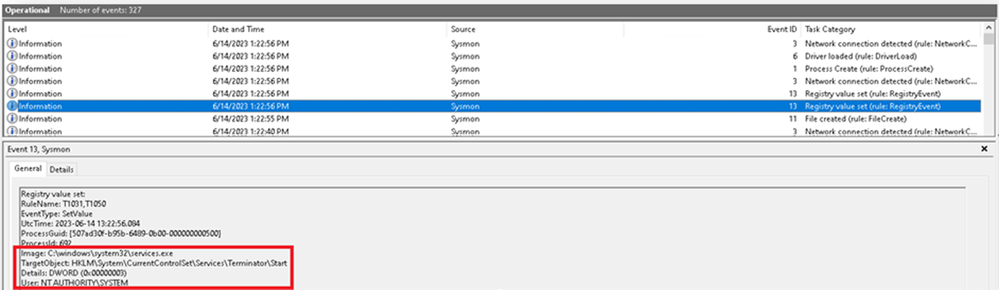 Figure 3: Sysmon Event Log, Event ID 13 - Service registry value set