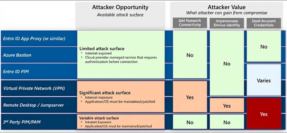 Figure 3: Security impact of different PAM approachesThird-party PIM/PAM solutions are often deployed on-premises or as a Virtual Machine (VM) in an Infrastructure as a Service (IaaS) environment and are usually reachable only from internal (intranet) systems. Even if they aren’t exposed to the internet, one stolen credential could let a threat actor reach them through VPN or other remote access methods.
