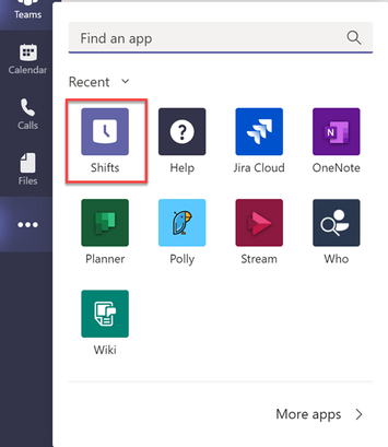 Shifts is a schedule management application in Microsoft Teams that helps you create, update, and manage schedules for your team. Shifts is enabled by default for all Teams users in your organization. You can add Shifts app to your Teams menu by clicking on the ellipses (…) and select Shifts from the app list.