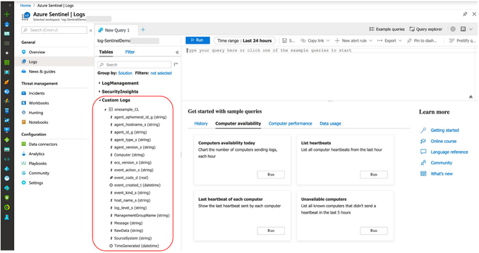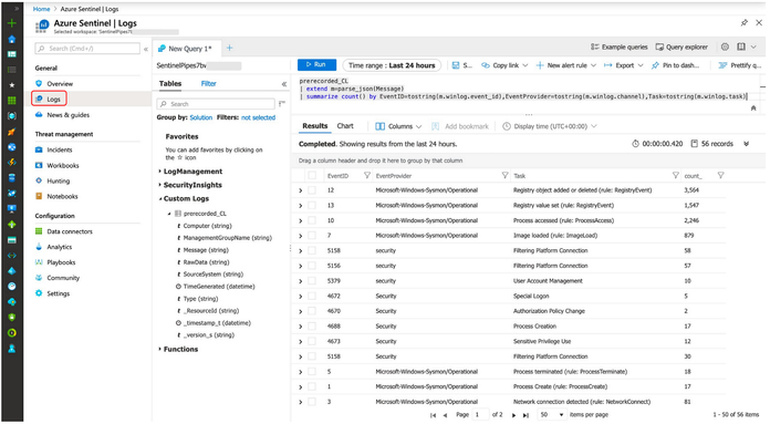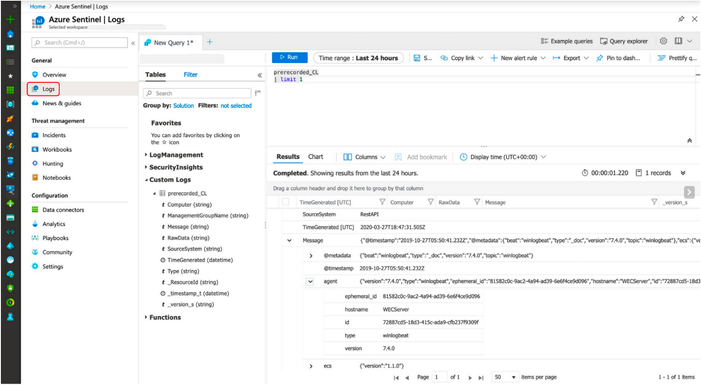 As you already know, click on Logs (Log Analytics) to explore the custom logs and their schema. One thing to remember is that the events flowing through this pipeline are packed inside of the Message field. As I mentioned before, this is to avoid exceeding the max number (500) of custom fields per data type in case you send a lot of events with different schemas.