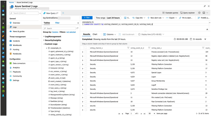 | summarize count() by EventID=tostring(m.winlog.event_id),EventProvider=tostring(m.winlog.channel),Task=tostring(m.winlog.task)