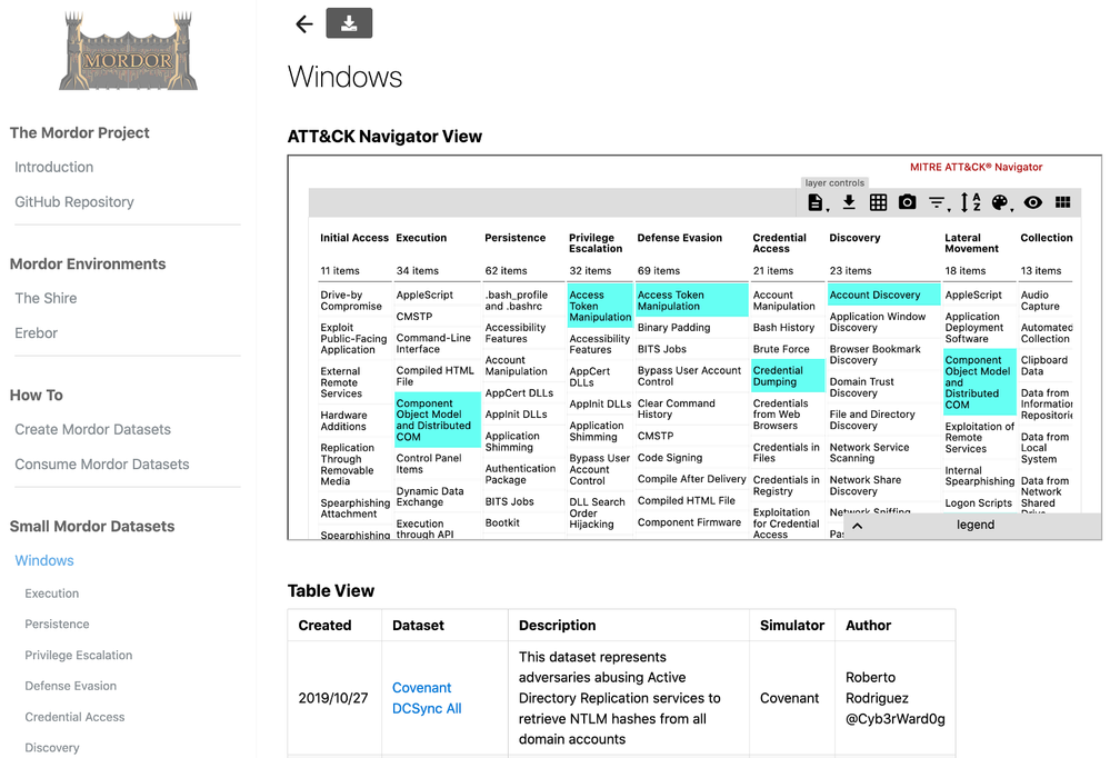 We can do the same as before and explore a few events to understand the event schemas. Also, since those events were generated as part of the Mordor project, you could focus on datasets mapped to specific ATT&CK tactics and techniques. The project comes with a Navigator View for the specific platforms that it supports (Currently only Windows).