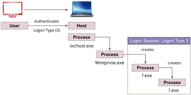 One thing that I like to look for when looking for lateral movement techniques is processes created under logon sessions that were initially created as part of a network authentication event (Logon Type 3). One example can be adversaries leveraging the Windows Management Instrumentation (WMI) and Win32_Process class to execute commands over the network. This behavior would generate something similar to this:
