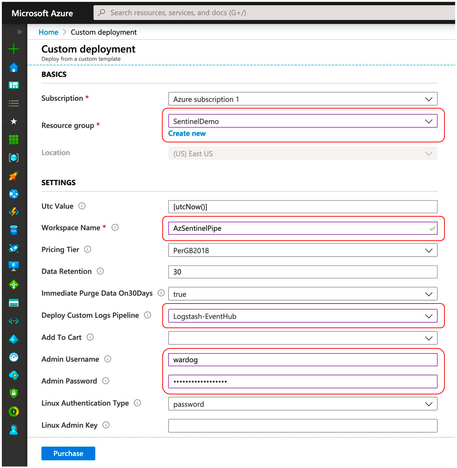 You will be taken to the interface to set deployment parameters. Set the Deploy Custom Logs Pipeline parameter to Logstash-EventHub. One thing to pay attention to is the virtual machine size. If you are in westus, you need to switch it to Standard_A3 . Also, make sure you set the AllowedIPAddresses parameter to restrict access to the Logstash box. Add your company or your house Public IP address.