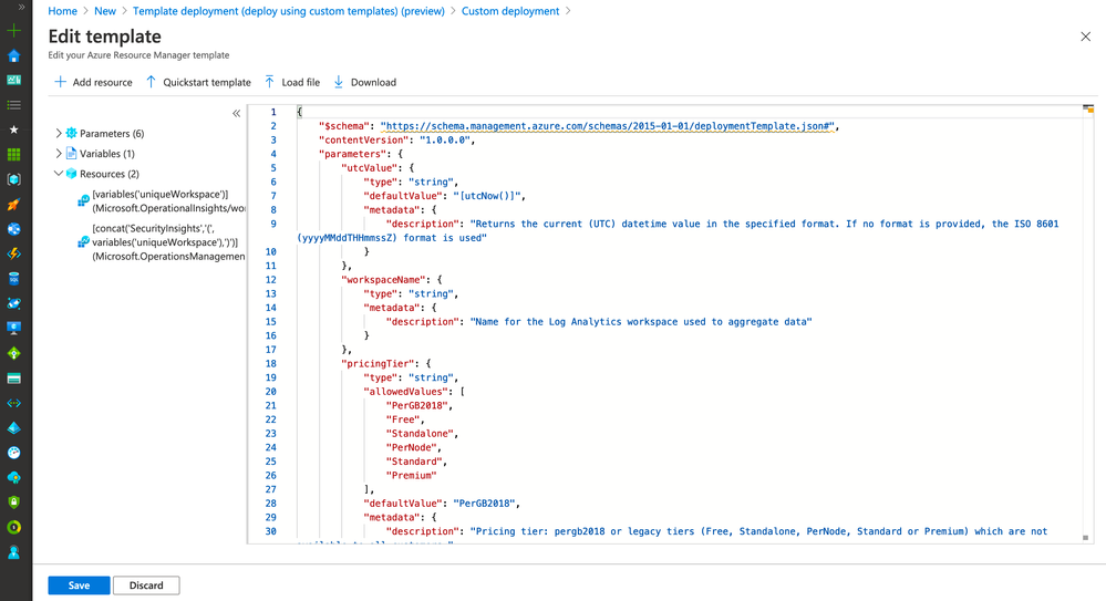 Next, I needed to define the Azure Sentinel solution and enable it on the top of the Log Analytics workspace. You can do it with a resource type found under the Microsoft.OperationsManagement resource types as Microsoft.OperationsManagement/solutions .