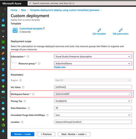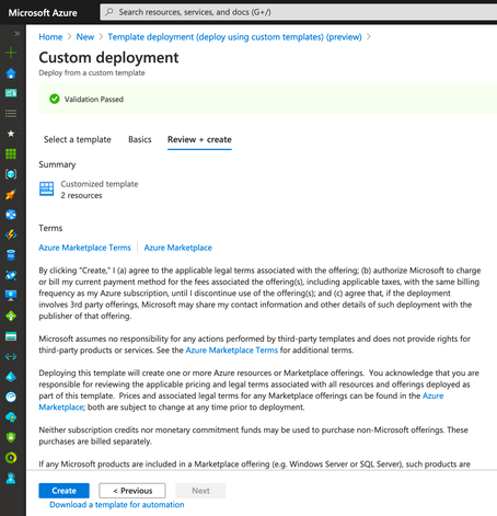 - Next, you need to set your subscription and resource group names. As you can see in the image below, you can directly create an Azure Resource Group if you donāt have one yet. Click on Review to validate the template and finally create to deploy your resources.