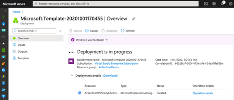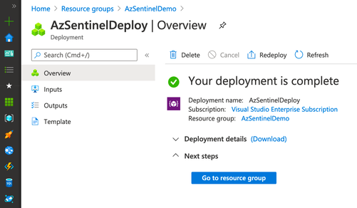 - Then, you can track the deployment of your Azure Sentinel resources by going to Azure Portal > Resource Group Name > Deployments