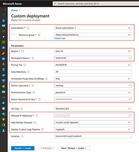 If you have resources running from the earlier deployment, I recommend to delete them (Lab environment). Similar to our previous deployment, go to Azure-Sentinel2Go > grocery-list > custom-log-pipeline. Select Logstash for the Deploy Custom Logs Pipeline parameter as shown below and add a mordor dataset to your cart (Add Mordor Dataset) . For this example, we are going to use the mordor-small-datasets scenario. Also, once again, make sure you set the AllowedIPAddresses parameter to restrict access to the Logstash box. Add your company or your house Public IP address.