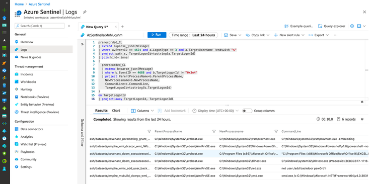 We can use KQL and its JOIN operator to look for a similar behavior without filtering on the parent process wmiprvse.exe. We can use events 4624 (An account was successfully logged on) and 4688 (A New process has been created) from the Microsoft-Windows-Security-Auditing event provider.