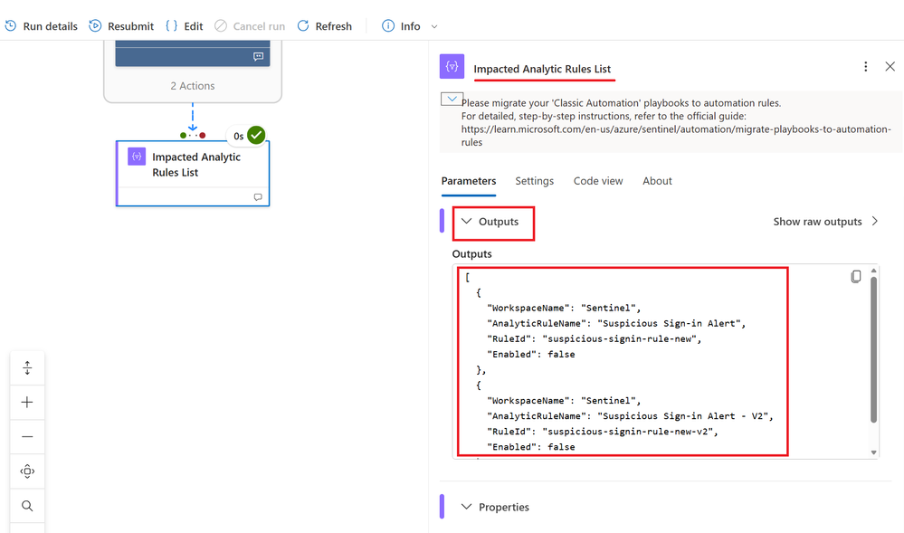 After deploying and running the tool, open the Logic App run history. The final action contains the list of the analytic rules which require migration.