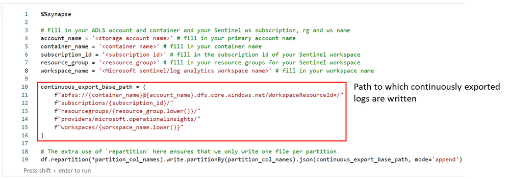 - Matching the partition scheme used by continuously exported logs – this means that means that continuously exported data and historical log data can be read from in a unified way by any notebooks or data pipelines that consume this data