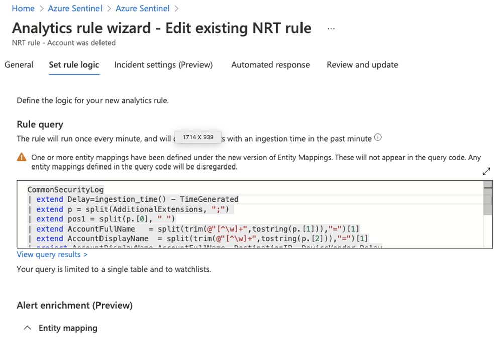 Since NRT rules track the ingestion time and not the event creation time (the TimeGenerated field), we can ignore the ingestion delay (the time between the event’s creation and its ingestion into the workspace).