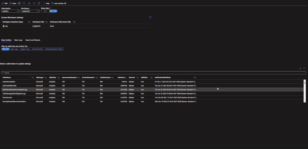 A workbook has been created that can be deployed to a Microsoft Sentinel environment. This workbook allows for users to view current configurations and configure individual tables for basic ingestion and archive. The workbook uses the same REST API calls as listed above but does not require authentication tokens as it will use the permissions of the current user. The user must have write permissions on the Microsoft Sentinel workspace.