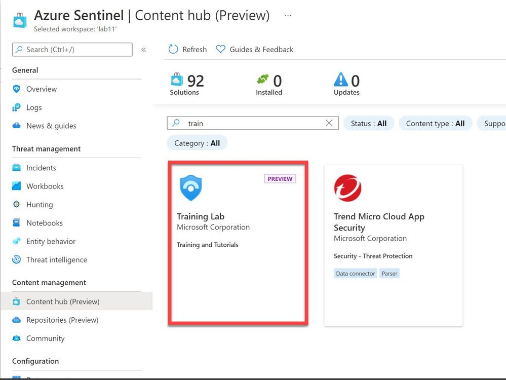 To deploy the training lab, go to the Content Hub from the Microsoft Sentinel portal and search for “Training Lab”: