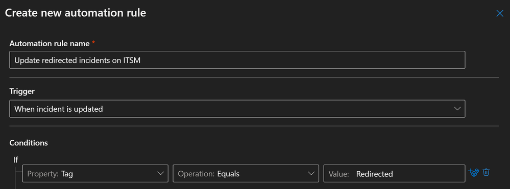 - The incident title is no longer predictable, as incident names can change through merging. If you use incident title as a condition, please change it to Analytic rule name and select the analytic rule that should trigger the automation.