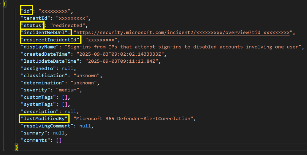 - redirectIncidentId: the ID of the target incident on Defender