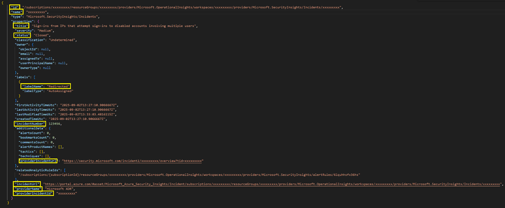 - incidentUrl: the url of the source incident (now closed) on Sentinel on Azure. Opening this url takes you to the old incident, which contains a banner with the new target incident url