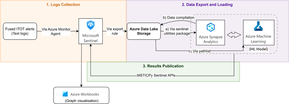 Our end-to-end integration process is broken down into three main phases, beginning with collecting text logs to Log Analytics Workspace (LAW), followed by loading these alerts from storage to Azure Machine Learning (AML) and finally publishing the results in Microsoft Sentinel.