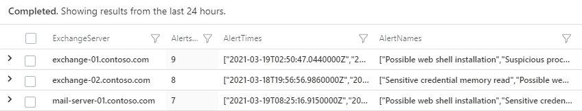 The results of the query provide insights into whether additional security alerts beyond web shell alerts have been observed on the host. Following deployment of a web shell it’s highly likely the threat actor will begin to execute further commands on the server, triggering additional alerts. In the above example three Exchange servers were observed with security alerts.