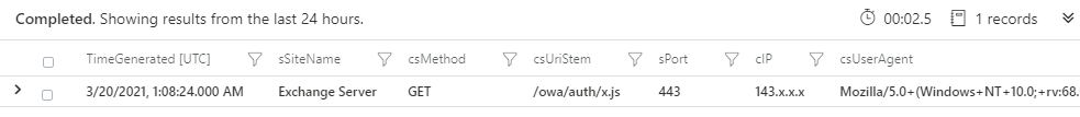 The Kusto “matches_regex” function can be used to perform regular expression matching on URI’s. The below example extracts events where the URI matches files associated with the exploitation of CVE-2021-27065 from W3CIISLog.