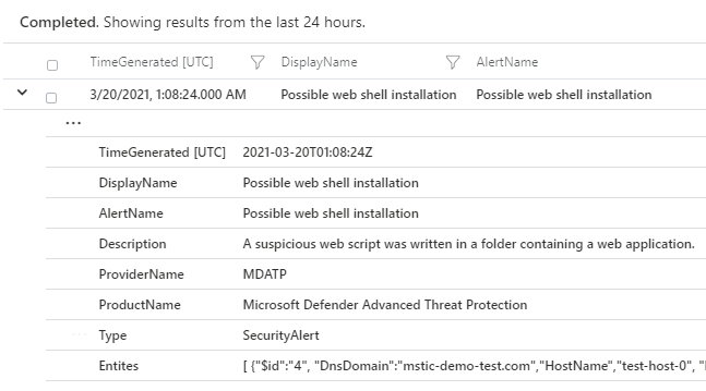 Microsoft 365 Defender (M365D) detects web shell installation and execution activity. Security alerts and incidents generated by M365D can be written to the SecurityAlert table in Azure Sentinel by enabling the appropriate connector. An example of a web shell installation alert in the Azure Sentinel SecurityAlert table can be seen below.