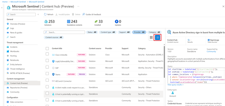 We are announcing new Microsoft Sentinel content hub capabilities in Public Preview that includes support for standalone content, a new list view and support for bulk / at scale actions like install, update, and delete multiple solutions and standalone content in a single step. Content hub enables centralized discovery, installation, and management of 250+ solutions and 240+ standalone content, amounting to a total 2500+ OOTB content items that includes data connectors, workbooks (reports), analytic rules (detections), hunting queries, SOAR connectors and playbooks. Microsoft Sentinel solutions are packages of Microsoft Sentinel content or API integrations, which fulfill an end-to-end product, domain, or industry vertical scenario in Microsoft Sentinel. These new capabilities enable customers to discover, install and manage OOTB content at-scale easily, to keep up with the growth in OOTB content.