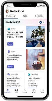 Within the pre-configured home experience in Teams, hospitality organizations can centralize access to key resources that allow frontline workers to find answers to questions quickly, stay connected to company-wide updates, and access relevant tools for their specific role. This home experience, available on desktop and tablet, offers a customized, company-branded dashboard that provides a quick way for frontline workers to stay in the flow of work.
