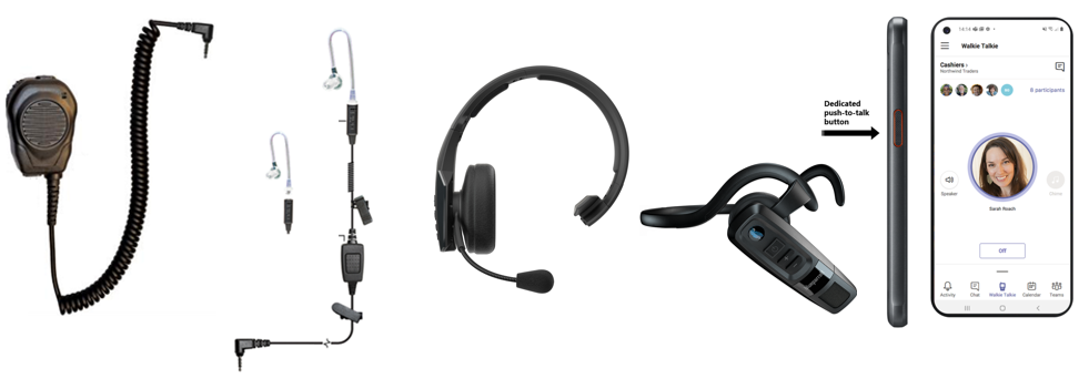 Customers have a range of options to choose from for push-to-talk enabled devices that integrate with Teams Walkie Talkie. BlueParrott announced the C300-XT MS and B450-XT MS wireless headsets and Klein Electronics has updated models of Triumph and Valor wired headsets. Samsung announced the Galaxy XCover Pro, a rugged push-to-talk ready phone optimized for a variety of industries .