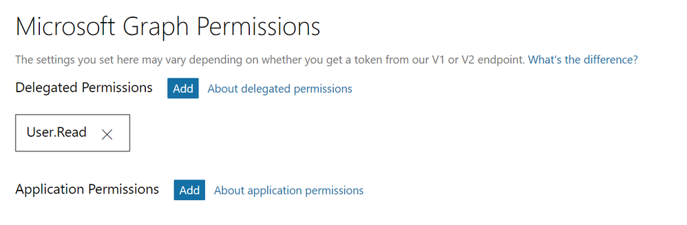 Redirect url settings for the sample app - In the “Microsoft Graph Permissions” section, add the permissions your app requires. The examples below assume the User.Read delegated permission, which newly-created apps will have by default.