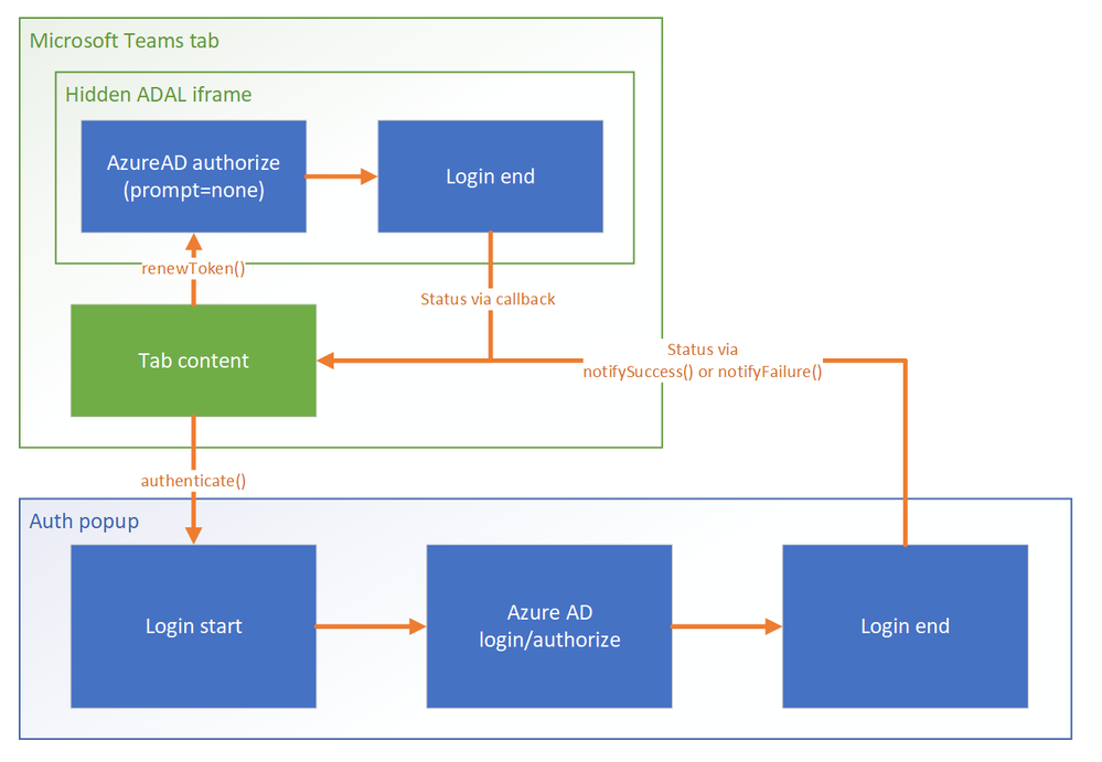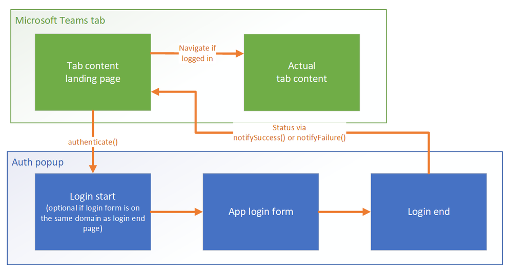 microsoftTeams.authenticate()is the start page of your authentication flow. This page must be on a domain that’s in yourvalidDomainslist, or else the popup will not open. - The authentication flow must start on a page that’s on your domain; don’t start it directly to your identity provider’s login or consent page. In our example, even though we’re using Azure AD, we begin at /tab-auth/simple-start rather than going directly to the Azure AD endpoint at https://login.microsoftonline.com. If you skip this step, the login popup may fail to close when you call