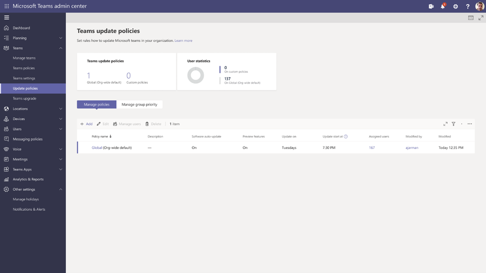 2. Select Teams>Teams Update policies from the left pane, as shown below.