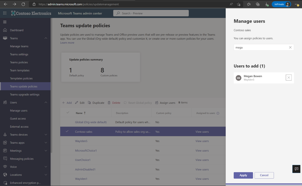 5. Once the policy is defined, you can assign it to a specific user or user groups by selecting the Policy name>Assign users>Manage users. Enter the user to add and hit apply (as shown below for Contoso sales policy)