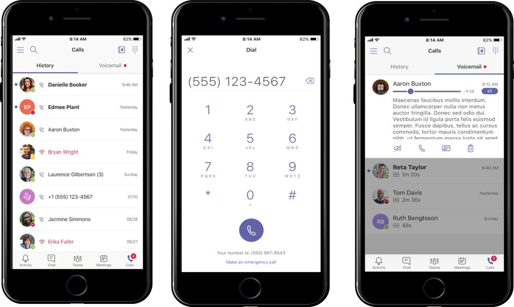 • Check voicemail –  retrieve all voicemail messages and transcripts*. You can also configure your settings such as changing your voicemail greeting directly in the mobile client.  (*Note: requires a license to Phone System in Office 365)