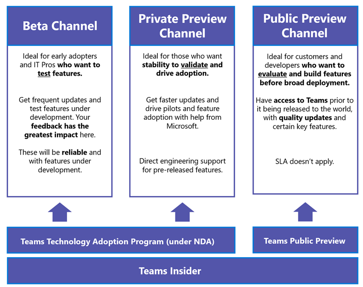 Insiders in this channel will see more stable features for validation and piloting adoption. There will be faster updates and adoption help from Microsoft. Pre-release feature support is provided directly by Teams engineering. This channel was previously called Ring 3 and, like Beta channel, is available to participating Teams TAP customers only under NDA and program requirements.