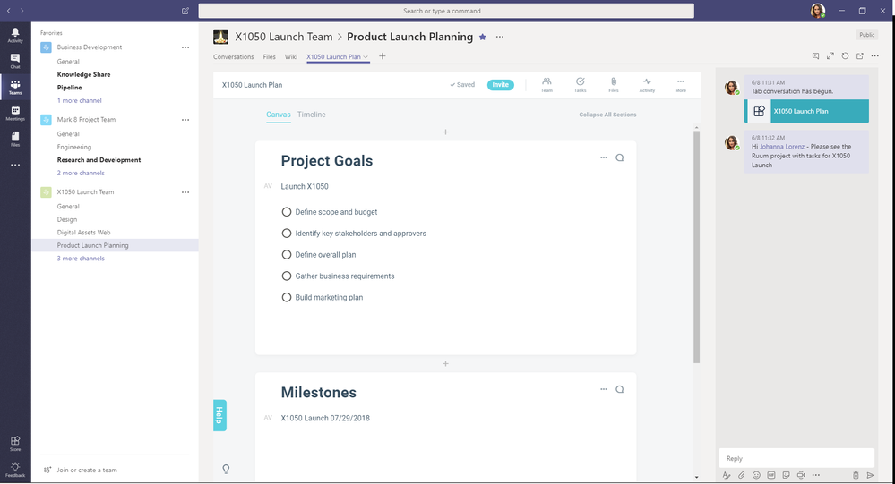 The SAP Ruum integration with Teams tightly couples the business processes and team conversations and provides a seamless user experience. For example, let's say you're trying to plan logistics around a product launch in Microsoft Teams. Being able to access SAP Ruum allows you to keep a record of what people are agreeing upon and what the current plan is—in parallel to the conversation. The integration between team conversations and project planning provides real time alignment – thereby enhancing organization productivity