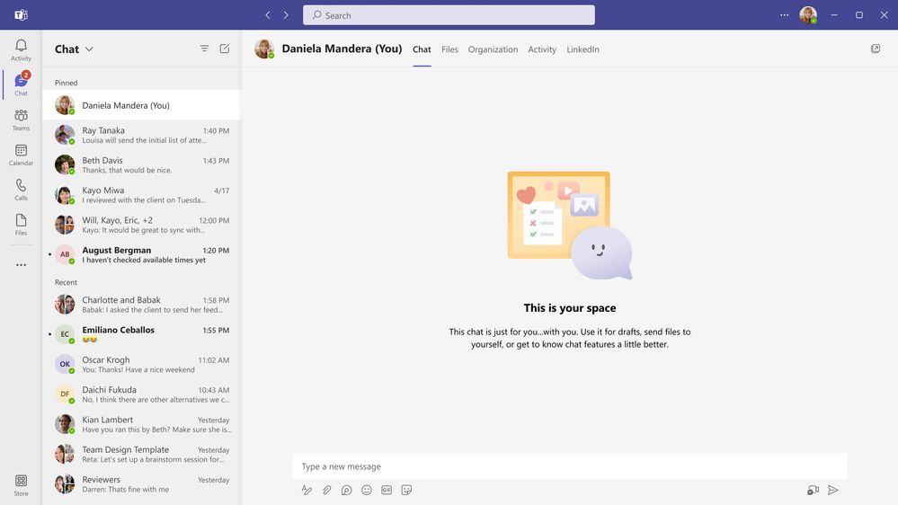 Chat with self provides an alternative way to stay organized and store important notes in chat. Pinned to the top of your chat history, you can draft messages or notes, save files for yourself and quickly access to share later. Chat with self is now generally available.