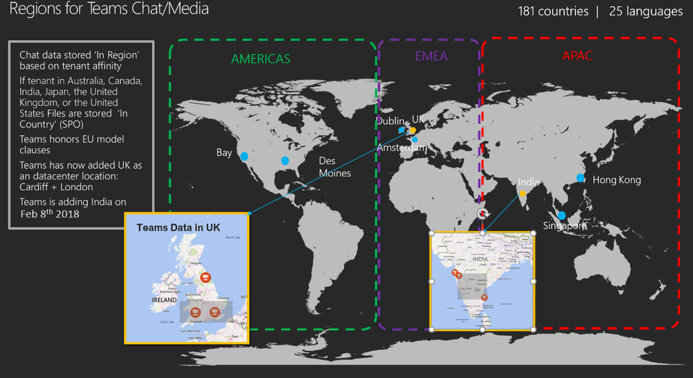 Last year in November, we announced Microsoft Teams data residency for the UK. Starting Feb 6th, 2018 Microsoft Teams will also provide data residency for India. This means that all new Microsoft Teams customers in India will have data for conversations and chat stored at rest in India. New customers are new subscriptions/tenants that provision after Feb 6th 2018 or customers who have not yet used the service prior to this date.