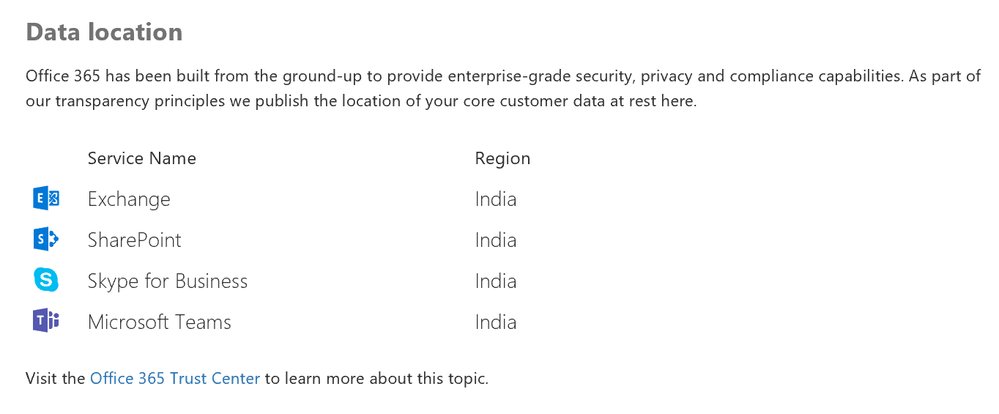 Exchange Online, SharePoint Online, Skype for business Online, Project Online and others already provide data residency in India. Please see the data center maps for more information about the location of data at rest for more Office 365 services and for all our geos in the world.