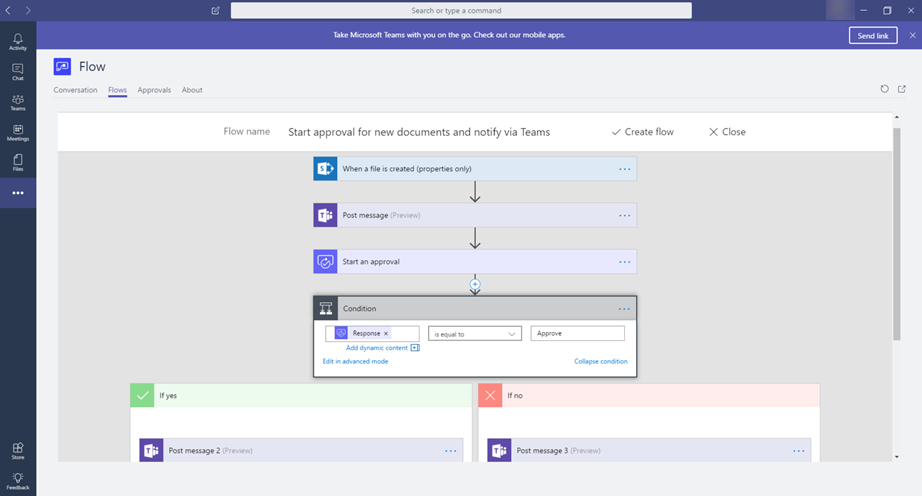 Microsoft Flow: Automate time-consuming and repetitive tasks by integrating your favorite apps and services with Microsoft Flow. With this integration, right from within Teams, you can create and manage flows, review your received and sent approvals, and launch flows with the Flow Bot.